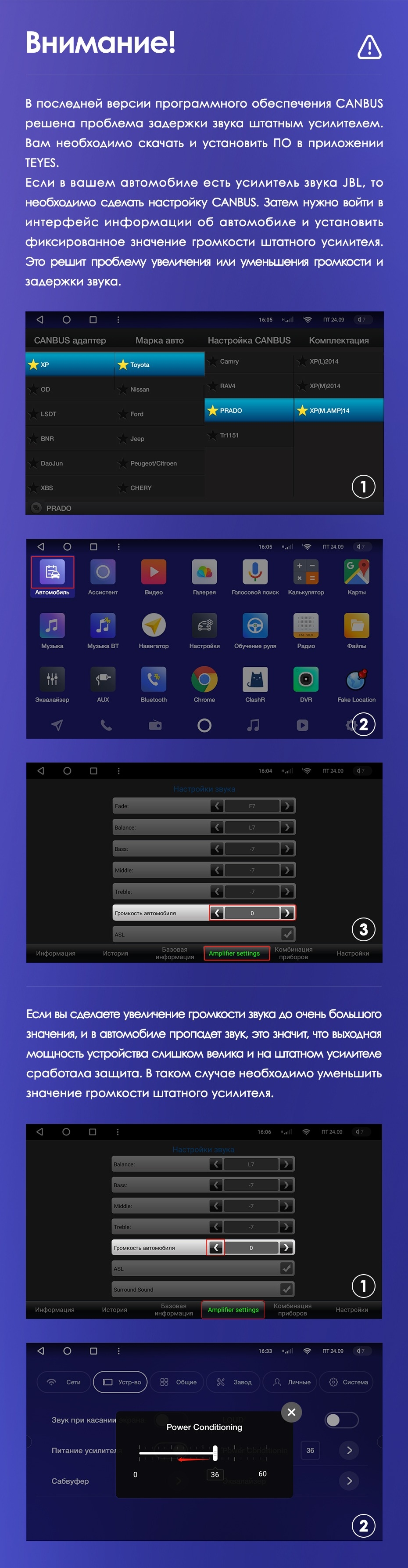 Производитель использует только современные технологические и программные решения, что не заставляет ждать результатов. Новинка компании получила объемный звук с широкими возможностями настройки. Любые помехи или задержки в работе магнитолы исключены. Звуковой чип DPS Adau1701 в сочетании с Rohman32107, подключение посредством оптоволоконного кабеля цифровых выходов — все направлено на превосходный звук.