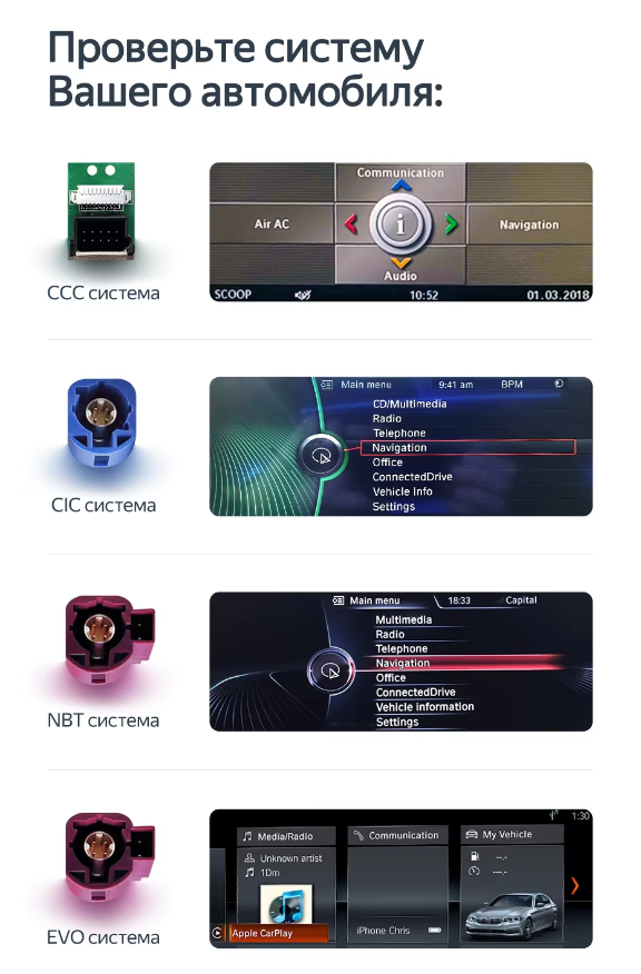 CarPlay — это система, позволяющая использовать iPhone в автомобиле, не отвлекаясь от дороги. Подключив iPhone к CarPlay по wi-fi (безпроводное соединение), можно пользоваться системой спутниковой навигации, делать звонки, отправлять и получать сообщения, слушать музыку и делать многое другое.
