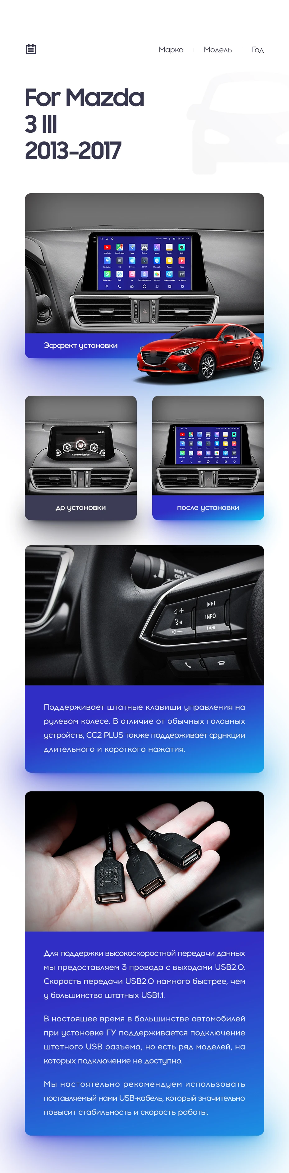 Полный комплект установки магнитолы Teyes с рамкой и проводкой можно выбрать в каталоге штатных магнитол Mazda 3 BM (2013-2017).