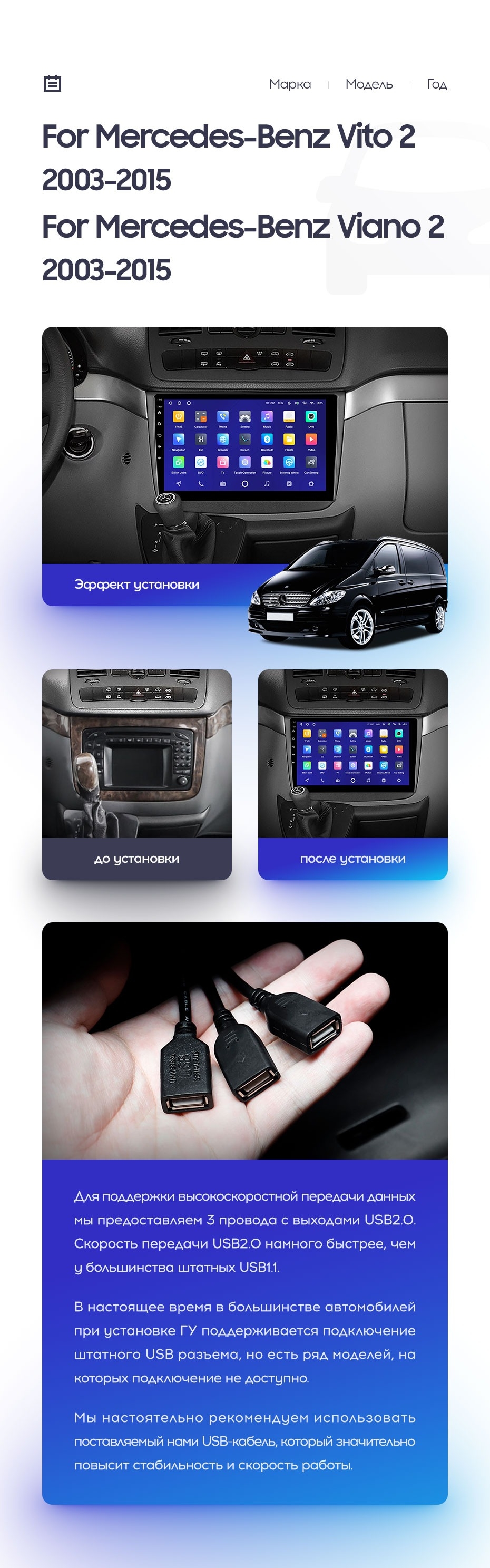 Установочный комплект для Mercedes-Benz Vito W639 (2010-2015) включает переходную рамку и проводку.