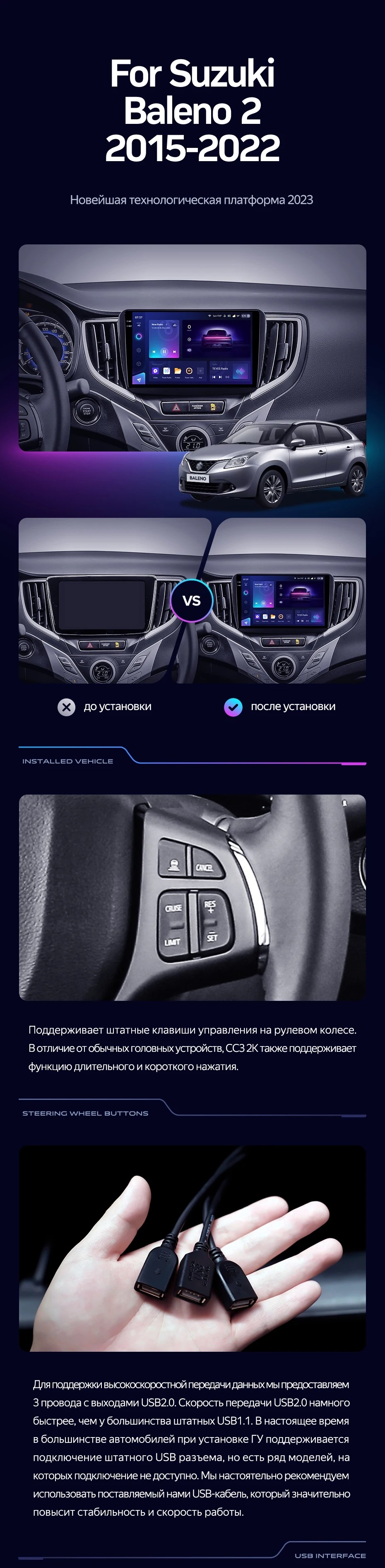 Полный комплект установки магнитолы Teyes с рамкой и проводкой можно выбрать в каталоге штатных магнитол Suzuki Baleno 2 (2015-2022).